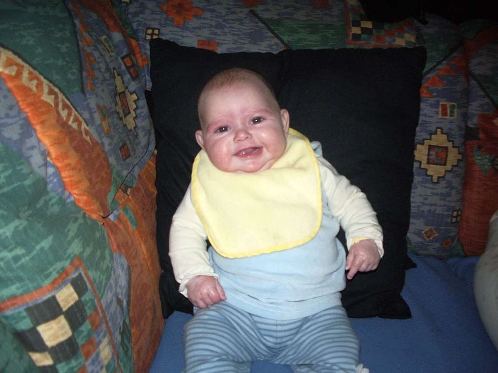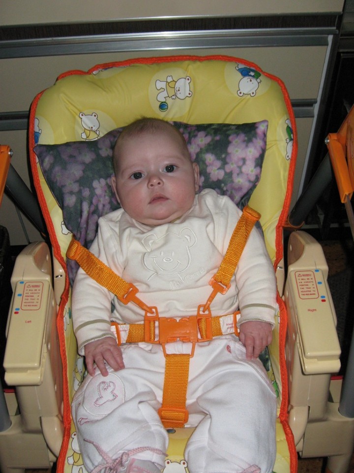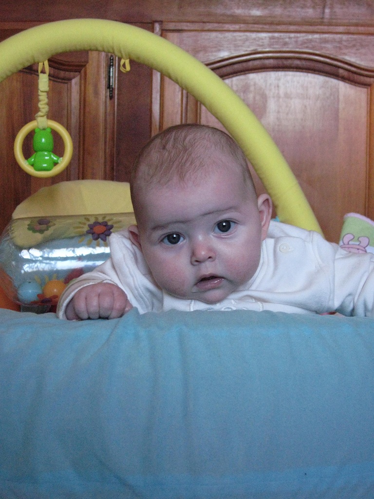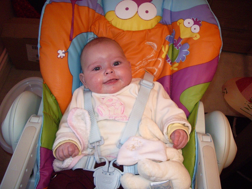 Aujourd’hui j’ai déjà 4 mois. C’était un mois très mouvementé, entre mon baptême, les fêtes de Noël et ma maladie… Maintenant je me repose et reste au calme à la maison. Je ne sors pas beaucoup à part pour aller rendre visite à mes Mamy car il fait très très froid en ce moment! Hier j’étais voir le Monsieur en blanc pour avoir mes vaccins, eh bien j’ai moins pleuré que la dernière fois, mais je le surveille quand même toujours du coin de l’oeil quand il s’approche de moi! Il a dit à Maman que je suis très très curieuse, mais ça elle le savait déjà depuis longtemps hihihi!!! Je pèse maintenant 6kg pour 60cm, un développement harmonieux selon lui 🙂