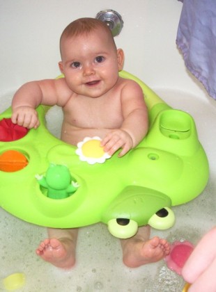 Papa m’a mise dans mon anneau pour prendre le bain ce soir. J’ai trouvé ça très intéressant et rigolo, mais je ne tiens pas encore bien assise toute seule alors j’ai tendance à glisser à l’intérieur de l’anneau… On le ressortira dès que je saurais me tenir assise seule, donc très bientôt