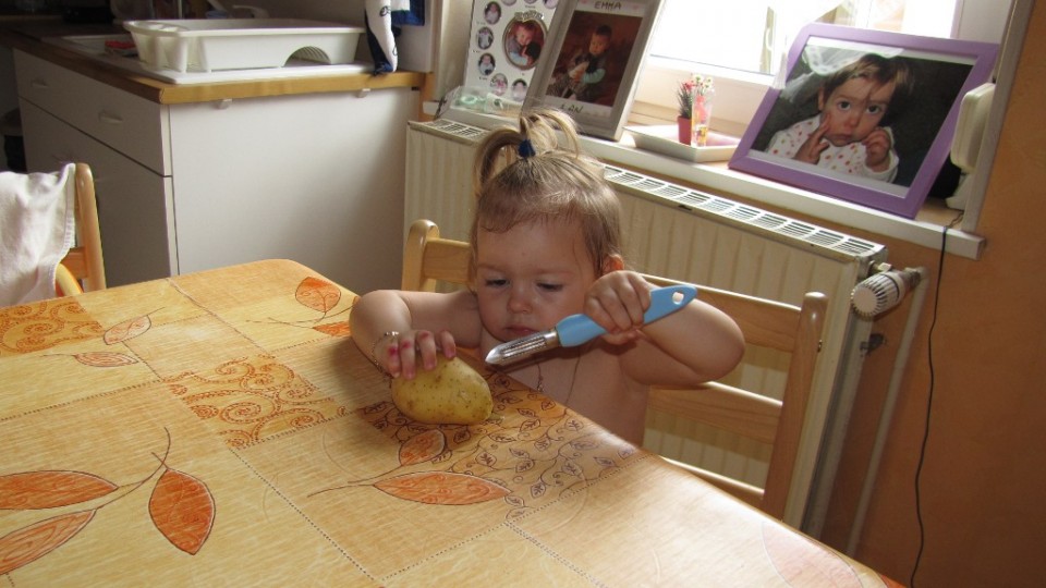 tu es rigolote, et débrouillarde, tu aurais pu te blesser avec l’économe … tu sais A T T E N T I O N à tes petits doigts !