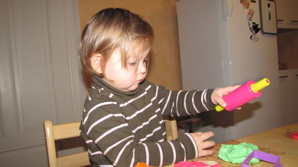 En même temps c’est la première fois qu’on me voit jouer avec ma pâte à modeler, mais il faut tout le temps être à côté de moi car à la moindre occasion : j’en profite pour en manger un petit peu, enfin non j’avale pas je recrache des morceaux tous mouillés un peu partout… Ou alors dès que Maman ne me regarde pas je mélange un peu les couleurs entre elles, et après c’est pas beau…