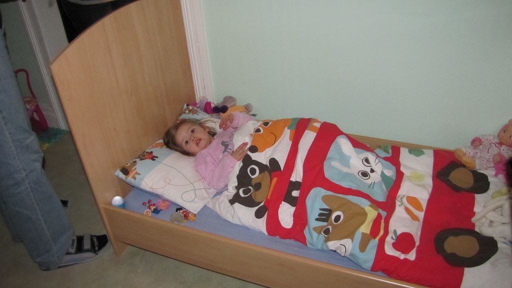 Et bien voilà, ton lit de grande fille est installé, maintenant il va falloir apprendre à ne pas sortir sans cesse de ton lit et dormir sagement jusqu’au lendemain matin comme d’habitude, j’espère que tu t’es endormie sans problème, fait de beaux rêves à demain