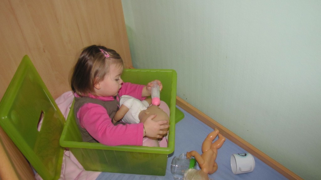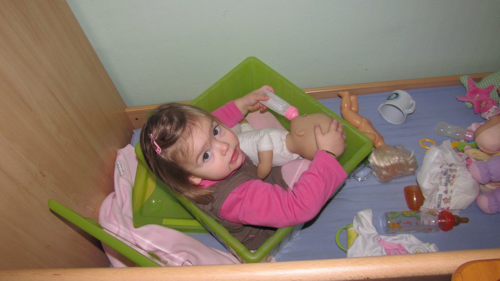 et tu grimpes te cacher dans le bac en plastique pour donner le bibi à ta poupée ??? maman t’as quand même vue