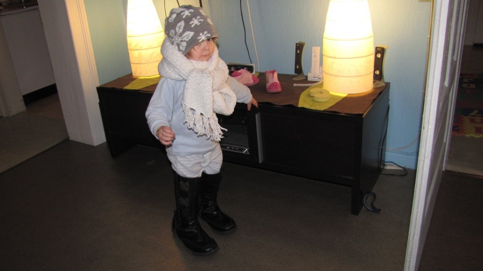 Emma, tu es déjà déguisée pour le carnaval? mais un peu chaudement, tu aimes mettre les habits des autre et surtout ceux de Maël.