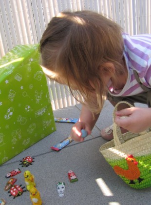 Ce matin quand on s’est levés on a découvert pleins de petits chocolats cachés partout, et même un cadeau pour moi et un pour Maël!!