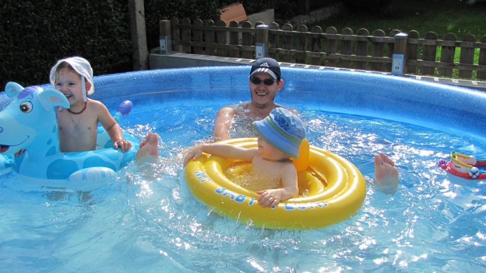 Oui une plus grande piscine car celle-ci a des fuites, alors bon on l’a garde encore cette saison pour le peu qu’on s’en est servie… Mais la nouvelle piscine est déjà là, on a pas prit un truc énorme juste la taille au dessus. Numéro 3 d’ici l’été prochain aura quoi 7 ou 8 mois, il pourra faire trempette aussi dedans, mais pas de bains prolongés comme Maël fait en ce moment non.